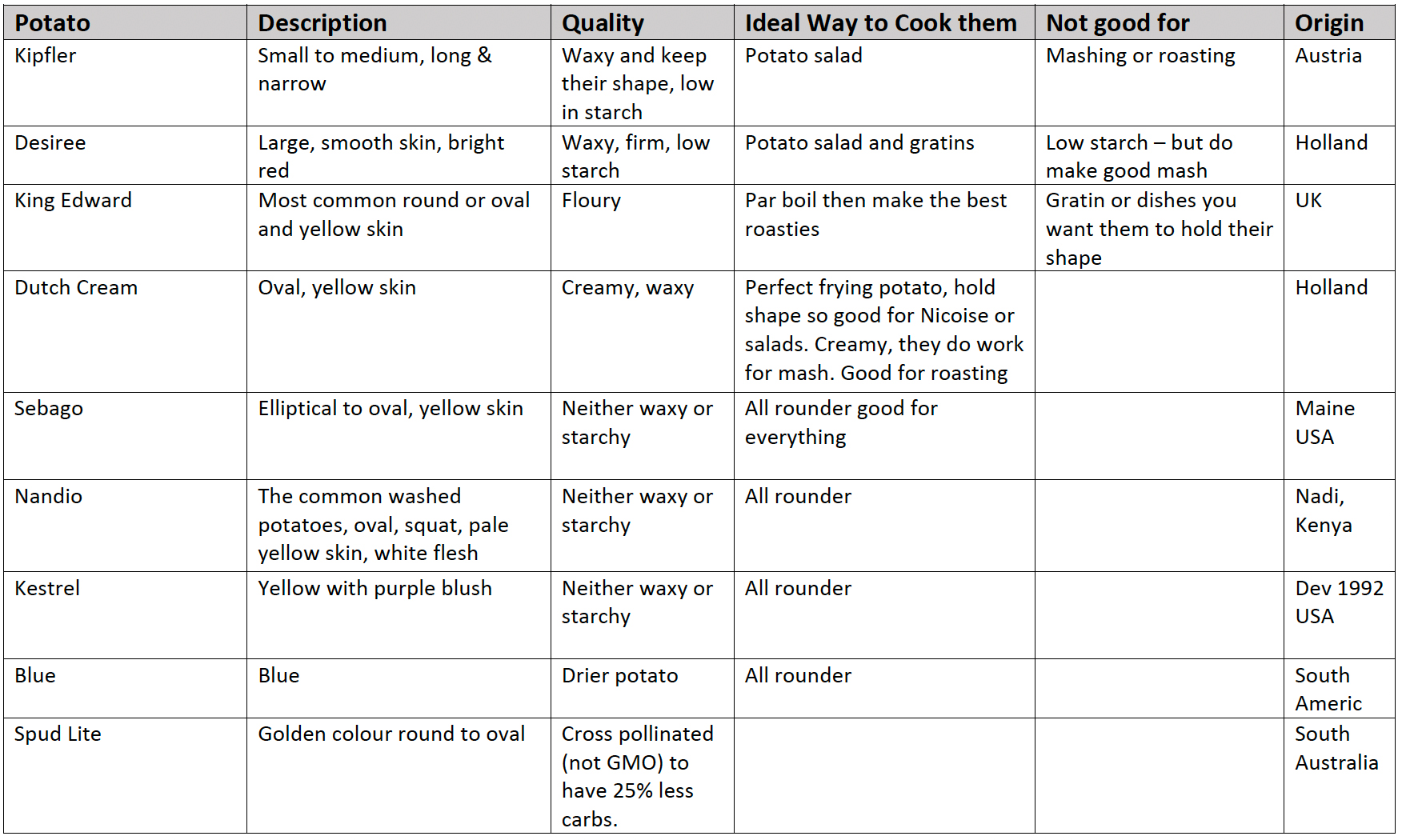 So this week I am singing the praises of potatoes from the rooftops and I have detailed the uses of the potatoes we get here in Australia. How country centric of me. I would like to add to this list so if you have a potato that you use regularly in countries other than Australia please send me the names of those potatoes and I will add to my research and to this list I have here.